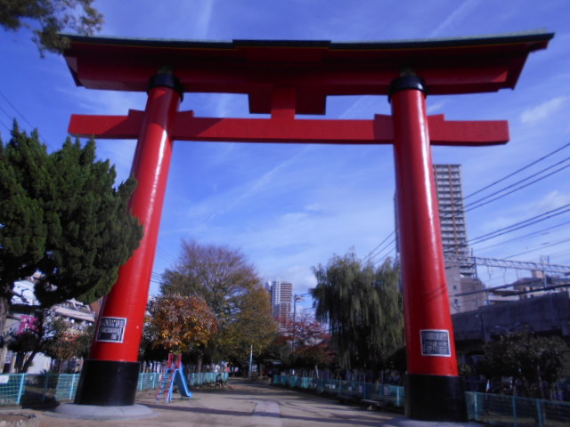 阪神電車高架沿いにひときわ目立つ朱色の大鳥居は、高さ17m、笠木22m、柱直径1.6m。鳥居に掲げられている額面は畳3枚分の大きさで、その荘厳なる雄姿はまさに尼崎のシンボルとなっています。 |