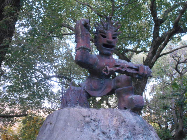 | 右手にはハンマー。左手には何かしらの製作物を持つ。銅製の像がにらみつけてくる。50年前の1972年の設置。当時は工業都市を目指して活気があふれていた。しかし、パナソニックのプラズマディスプレー工場が閉鎖になって以降、明るい話題に欠ける。人口も西宮市に抜かれてしまった。 |