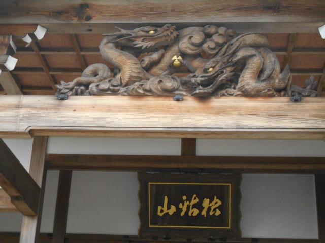 | 護摩堂正面を飾る龍の透かし彫り。