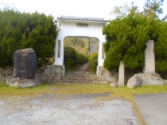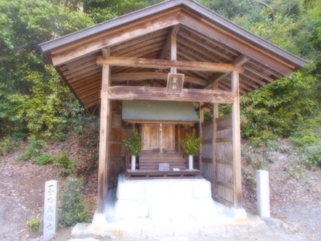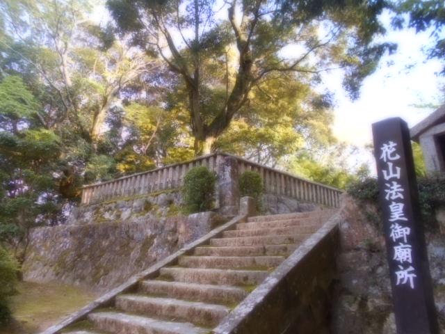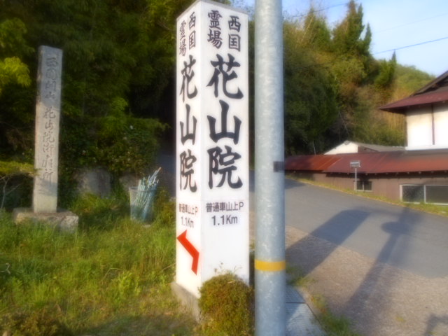 | バス停の横から登山道に入る案内。 石塔には 「西国開山 」花山院御廟所」とある。 |