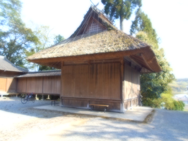 | 舞殿 県指定文化財 入母屋造。 茅葺。 本来は桁行1間梁間2間の舞殿として建てられた物に、隣接する長床を廊下で結んで橋掛かりとし、能舞台として使っている。舞台床は中央をやや高く盛りあげ、床下には大甕を埋めて音響効果が出るよう、そして背面を板張にして鏡板にしている。 創設年代は不明であるが、社記に「享保11年(1726年)舞堂修繕」とあり、柱が大面取りであることから江戸初期と考えられる。能楽奉納の始まりは寛文年間(1661年〜)からであると伝える 三田市HPより |