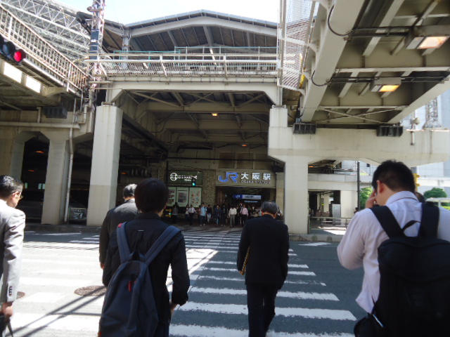 | 9:31 大阪駅西口から横断歩道を渡ってウォークの始まり。昔ここにあった中央郵便局がどっかに移転し、西梅田スクエアとかに変わって久しい。 この辺一帯にスキーバスが並んだのも昔。造船会社勤めの土日度に添乗員として野沢温泉に行っていたのも遠い昔。 |