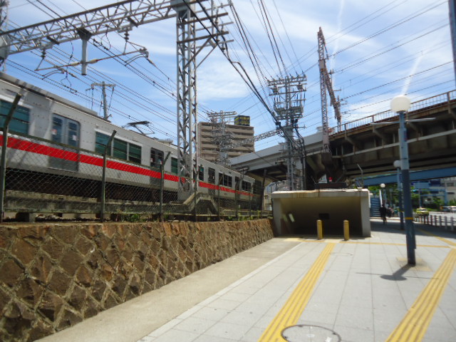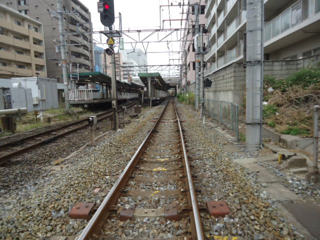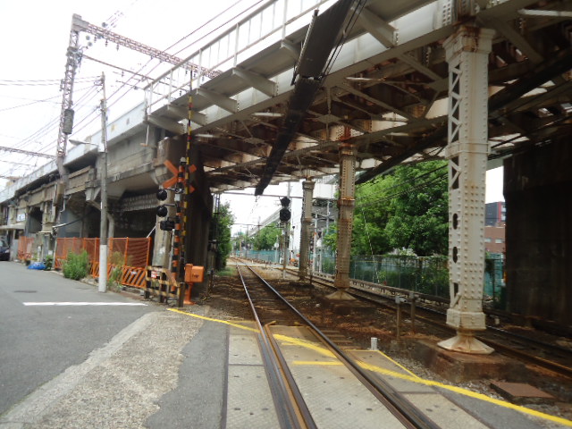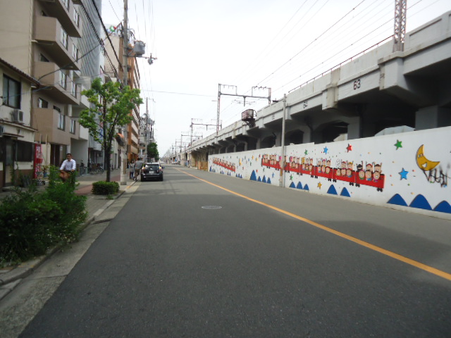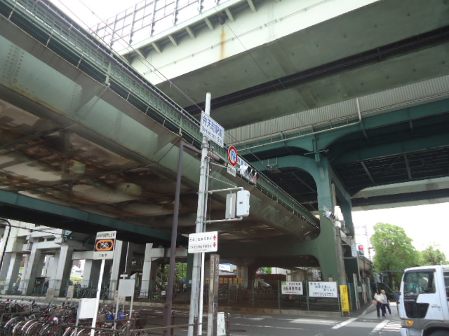 | 13:53 寺田町から鶴橋駅辺りまで環状線と路側道路がまっすぐに続いている。 |