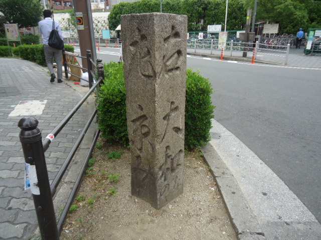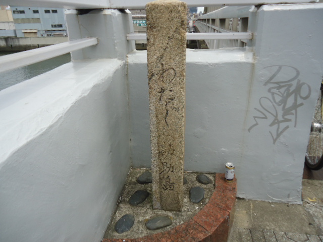 | 12:02 わたし(渡し)勘助島 と書かれた古い石碑。 木津川に架かる橋の袂で。 |