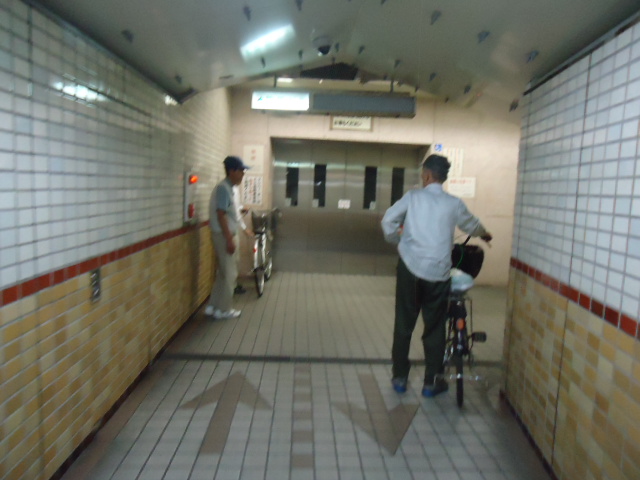 | 10:54 歩行者専用の安治川隧道。地下14m、長さ80mの地下通路を両岸のエレベータでつなぐ。 安治川を渡る橋を探したが分からずにあちこちさまよった。 |