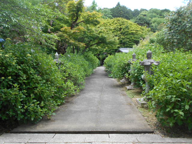 | 参道にはあじさいが枝を伸ばしています。もう少しすれば綺麗な花の競演が始まります。 |