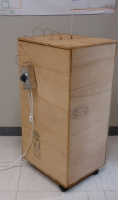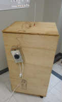 My Smoker 外観 コンパネを約4等分し、側板にしました。 上部蓋に、棒温度計、温度センサーを取り付け、側板にサーモスタットを引っ掛けています。 |