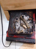 | Smoker下部の扉に入れている電熱器。電熱器上にはさくらチップ用の金属製皿を載せています。 | アールテック製のサーモスタット。 左の凹プラグに電熱器を接続し使用します。上部は「液体膨張式」の温度センサーです。 |