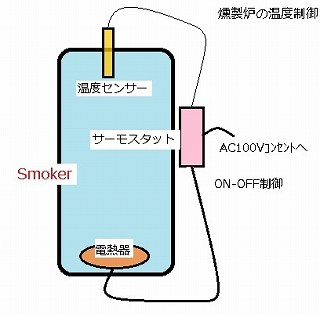 | Smoker の温度制御 温度設定値±10℃の精度でサーモスタットが電熱器をON-OFF制御します。 |