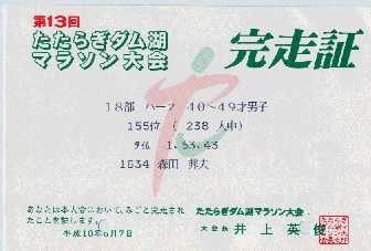 大会名:第13回たたらぎダム湖マラソン 場所:朝来町 DATE:1998.6.7