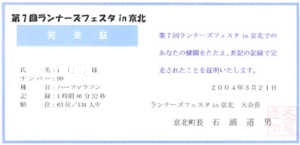 受付を済ませて、体育館のいつもの通路に陣取り、ゼッケンなどをつけたり、着替えたりで時間を費やした。通路横にはゲストランナー原田伸郎の控え室があり、9:30頃本人が到着。テレビで見る原田伸郎は横柄な感じを受けていたが、素顔で見た本人は、以外と気さくな感じで、僕たちに丁寧に挨拶を返していた。