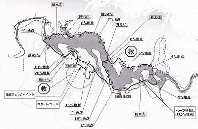 スタート後は上流に向かって走る。ダム湖右側堰堤を3.5km位行ったところの橋をわたって、今度は下流側に向かって走った。