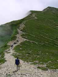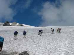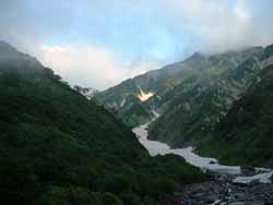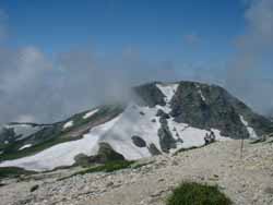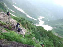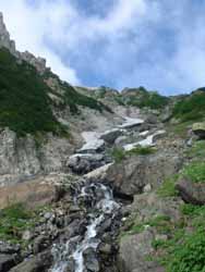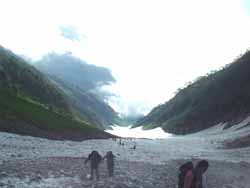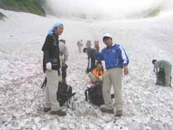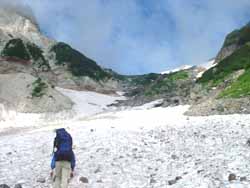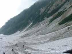 | 大雪渓 | 5:50に小屋を出発。中高年のおばさんたちの大グループよりも先に雪渓に入らないと何時着けるか分からないので急いでの出発だった。 すぐに、大雪渓にかかる。遠くから見れば綺麗な雪渓も、足の下のものは真っ黒で、触ろうという気も湧かない。 何時落石があるか分からないので、余り休憩もしておれない。ひたすら、足元を見つめながらの行進だった。 |