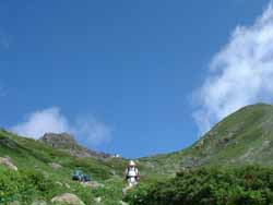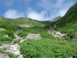 | 避難小屋〜白馬山荘 | 8:30避難小屋に到着。大雪渓と違って、緑にあふれ、お花畑に堪能した。 避難小屋入り口で2組のけが人を出会う。パトロールを呼んでいたが、いずれも中高年。自分の体力の限界をわきまえられる年だと思う。 |