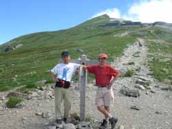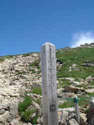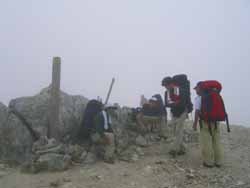 | ヤットたどり着いた稜線。 | 白馬山頂を背に。途中に見えるのは、ホテルみたいな白馬山荘。 | 中部国立公園と書いた標識。風雨の強さを感じさせるたたずまい。ペンキは剥げ落ち、読めない。 | 白馬山頂で全員集合。 |