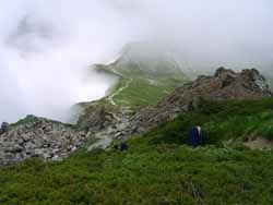 上がって来たふもとを見下ろすと、雲海の中にあった。 | 。雪渓のっ中での小休止。腰を下ろすこともできず、落石も怖いしで、永いせずに出発。 |
