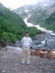 | 鑓温泉小屋 | 小屋下のキャンプ場にたどり着いた頃に雨が降りだした。急いで、テントを張り食事は小屋の外のひさし下で作り、小屋の中に入り込み食べた。その小屋も8時には追い出され、テントに入って酒の勢いで寝た。 |