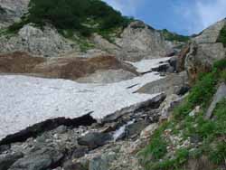 | 落石とともに巻き込んだ砂で色が変わって縞縞模様の雪渓。 | 雪解け水。冷たくて美味しそうですが・・・・。 | 落石の巣:小雪渓のトラバース。緊張の時でしたが、生徒は漫然と歩いています。 | 雪渓の終点。岩に駆け上がって一安心。縁の雪渓はいつ崩れるかわかったものは無い |