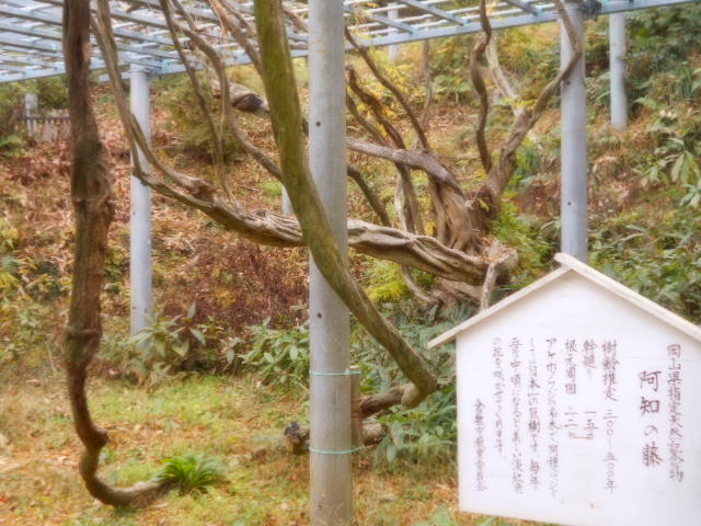 | 阿智の藤 樹齢推定 300から500年 幹周り 1.5m アケボノフジの名木で、同種のフジとしては日本一の巨樹です。毎年5月中頃になると、美しい淡紅色の花を咲かせてくれます。 説明板から |