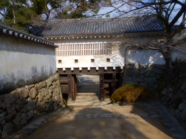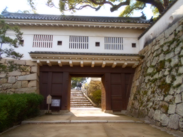 | 不明門 表書院(藩庁)の南端から本段(城主住居)へ上がる石段の入口に設けた渡櫓門、天守閣のある本段全体の入り口を固めた大形の城門である。普段はこの門は閉ざされていた事から「不明門」と呼ばれた。明治の廃城後取り壊されたが昭和41年、鉄筋コンクリートで再建された。 説明板から |