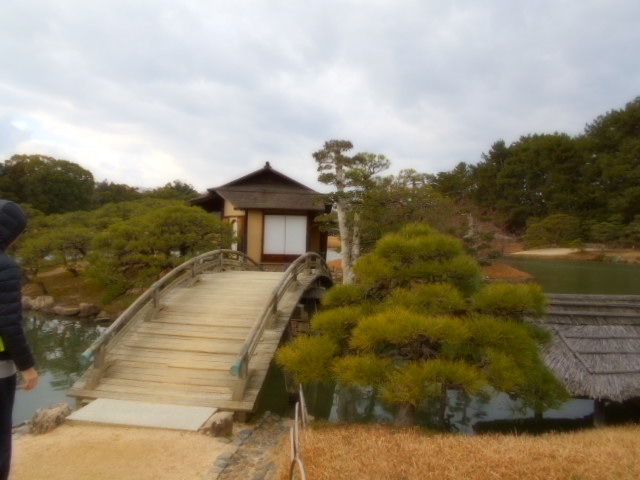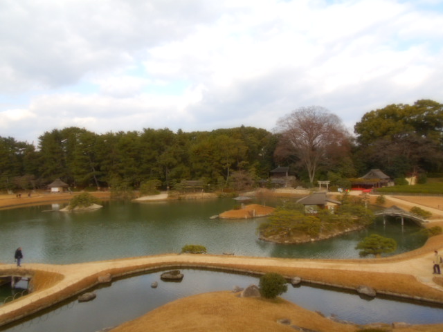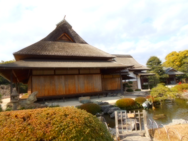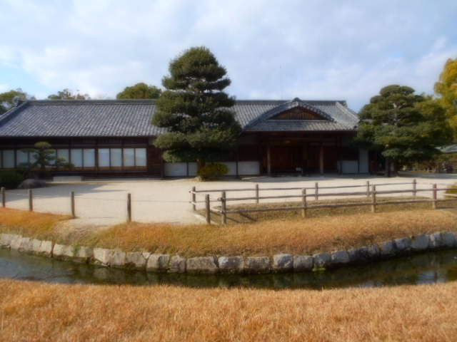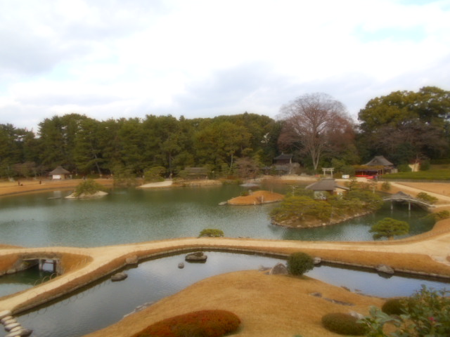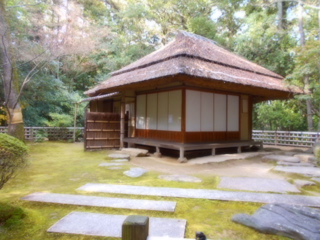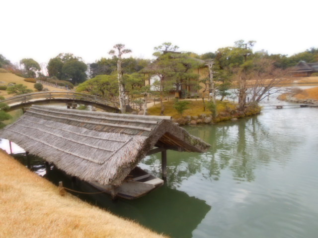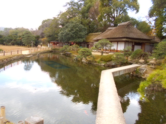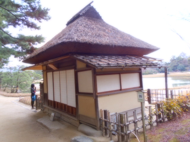| 康池軒(れんちけん) 戦災をまぬがれた数少ない建物の一つで、池に架かる石橋や対岸の小島なども、往時の姿を今に伝えています。この建物からは沢の池越しに見える松林や曲水と池の段差など、起伏に富んだ景観を眺めることができます。 説明板から |