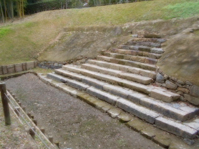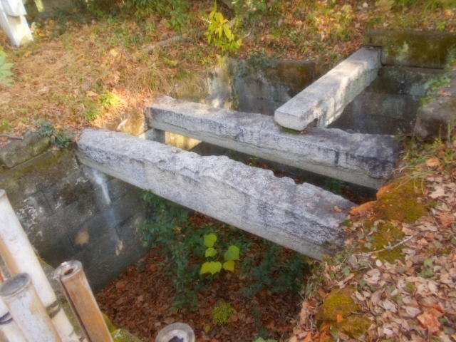 | 穴蔵 香川県豊島産の凝灰岩の切石で造られており、幅3.8m、奥行2.9m、深さ2.3mあります。もとは屋根があり、非常用の食料を保存していたのではないかと考えられています。 説明板から |