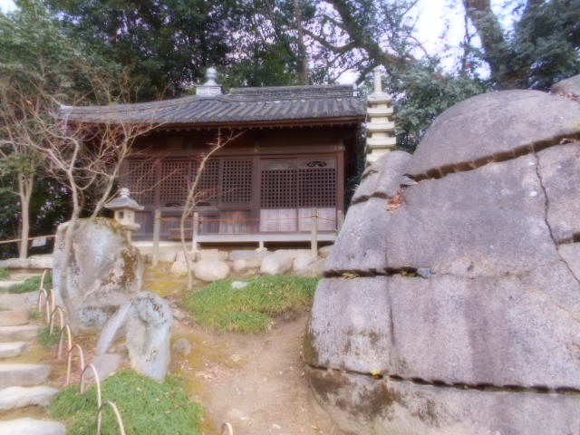 | 慈眼堂(じげんどう) 池田綱政が元禄10年(1697)に池田家と領民の繁栄を願って建立し、観音像を祀っていました。境内には、花崗岩を36個に割って運び、元の姿に組み上げた烏帽子岩、仁王門、板張りの腰掛などが伝わっています。 説明板から |
