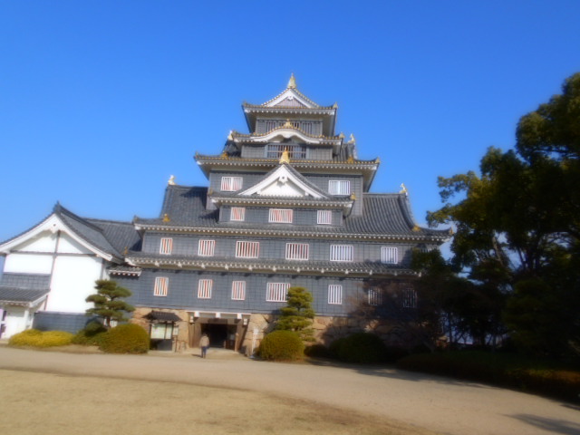| 天守閣 宇喜多秀家が岡山城の象徴に建築した三層六階建ての望楼形天守閣で、城郭建築物に天守閣が出現して発展し始めた時期の構造的特徴を伝えていました。城主の権威を象徴する書院造りの居間(城主の間)が設けてあり、初期の天守閣の性格を物語っています。昭和20年の空襲で焼失しましたが、昭和41年に再建され、城主の間も復元されています。 説明板から |