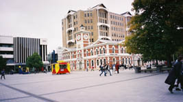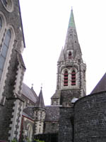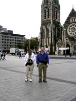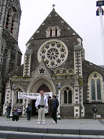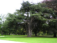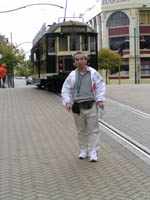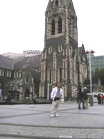 | クライストチャーチ大聖堂の先端部分。避雷針みたいに尖った先端は、天を刺しています。 | 大聖堂広場で。夕闇が迫ってきて辺りは薄暗くなってきた。といっても、サマータイムやらで8時頃まで明るかった。 | 大聖堂広場からウースター通り、アーマー通りを通って一周するチンチン電車。運転手がガイドを兼ねて、客を笑わせているが、こちらには全く解らない英語の世界だった。 | Botanic庭園内の木々。日立製作所の宣伝"この木、何の木"に出てくる木を連想してしまった。どの木も大きく枝を広げても広げても折れないようでした。気候に恵まれているのだろうか。庭園内や街中でも清掃夫の姿を全く見なかったが、ゴミは何処にも落ちていなかった。くわえタバコもないし、飲食店でもタバコを吸う人を見かけなかった。 |
