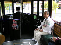 | チンチン電車を背に。結婚式を済ませたばかりのカップルも記念撮影を直ぐ横でしていたが、撮るのを躊躇ってしまった。惜しいことをした。 | チンチン電車(TRAMWAY)内。 運転手はガイドを兼ねており、ずーーーとシャベリっぱなし。その内容はまったく理解できずだったが....。 |