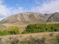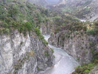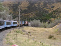 | クライストチャーチ駅を出てすぐの田園風景。延々と続く牧草地の境界は、防風林を兼ねた木立ち。牛や羊が所々でのんびりと草を食んでいた。 | 列車は草原を通り抜け、山に近づいてきた。太陽が出たころから、山越えにかかる。川沿いに峠に向けて、ゆっくりと登っていく。 | 蛇行を繰り返しながら、トンネルを抜けながら、列車は高度を上げていきました。観覧車両は、窓が無く風通しが良いのは良いのだが、トンネルに入ると最悪。 | ワイマカリリ川の峡谷。こちら側の谷には氷河が流れていないのか、幅の狭い川が急角度でうねっていた。 |