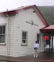 | 南アルプスを横切る峠(アーサーズ・パス)の北は氷河の谷。氷河が残した爪あとは小さな池に。大きな爪あとは細長い湖に。 | グレイマウスの駅舎。 | 雨に煙るグレイマウスの街。 |