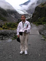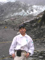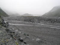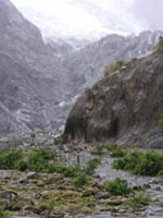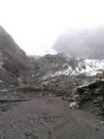 | 19:15〜 | 氷河見学 | 車を下ろしてもらってから、徒歩で氷河の見える地点まで歩いて30分。たどりついた地点から見る氷河は埃に汚れ真っ黒。防護柵から奥に、20〜30mにある氷河も今は、地球温暖化にやせ細り、無残な姿だった。 |