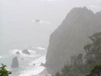 | FOX GLACIERでのトイレ休憩で。 | 雨の中、煙る海岸線。ハースト川付近 | THUNDER CREEK FALL 豊富な水量が美しい滝をつくっていた。 |