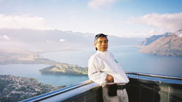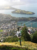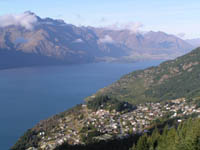 | 展望台にあがるテレキャビン。 | 下に広がるクイーンズタウンの町。湖に突き出た手前は:クイーンズタウン庭園。向こうは:ゴルフ場。深い湖の色は澄んでいて、美しい。 | 展望台の南西に広がる湖と山並み。 | 展望台で。クィーンズタウンの街とワカティプ湖を背に。 |