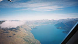 | 12:00 | クイーンズタウン離陸 | 飛行機の窓越しに見る湖も青く綺麗だった。牧草地は牧草の育成状態によって色が違い、タイル模様でとなってこれも美しい。 |