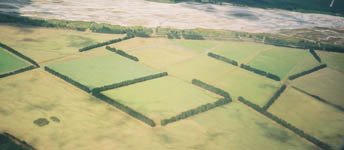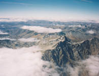 | ワカティプ湖の上空で機窓から。 | ワカティプ湖の横にそびえる山脈。氷河はここを始点に南に北に滑り降りていった。削り残した硬い岩盤からなる険しい山々。 | 牧草地は防風林を境に色を変え、タイルを敷き詰めたように見えました。羊や牛は牧草を食い尽くすと次の牧草地に移されます。 | |