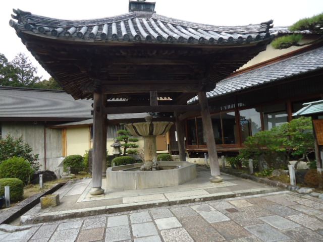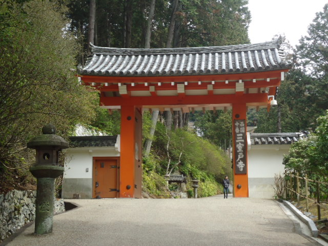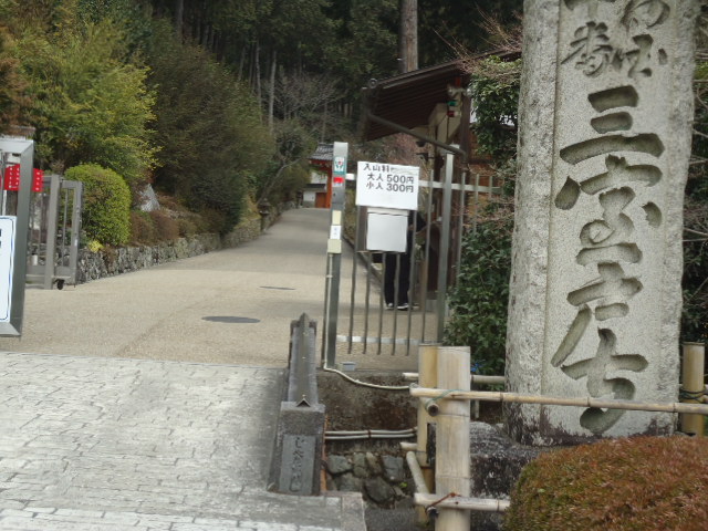 | 11:40 三室戸寺の入口に立つ石柱。入山料500円は伽藍の数に比して高いように思う。 |