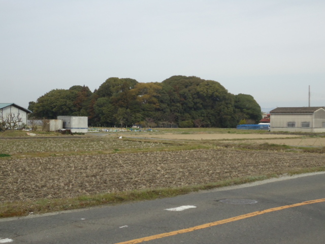 | 8:33 飯岡車塚古墳。 前方後円墳 長さ81m、後円部の直径60m、前方部の幅は45m、高さ4.5m、竪穴式石室で明治35(1902)年発掘の際に石釧、車輪石、鍬形石、勾玉、管玉など、多くの玉石製品が出土した。古墳の表面は葺石(ふきいし)でおおわれ、周りは埴輪(はにわ)で囲まれている。埴輪のなかには楕円筒埴輪があることが、昭和51(1976)年の発掘調査でわかった。石室の大きさから4世紀後半とされる。現在は前方部は茶畑となり、後円部には「上殖葉王古墳(かみえばのみこ)」と記した石標が立つ。 |
