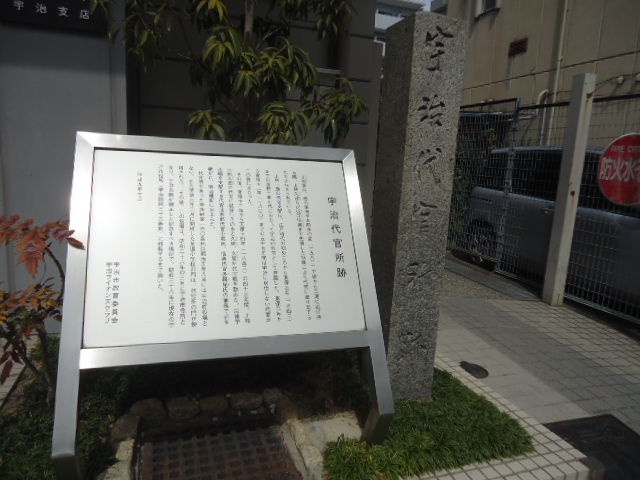 | 宇治代官所跡 上林家は、徳川家康が本能寺の変(1582)で堺から三河に逃げ帰る際、上林久茂らが近江信楽まで先導した功績により代官に取り立てられたと伝えられている。 上林一族の代官支配は、江戸時代の初めころから寛保三年(1743)までの百数十年七代にわたって宇治の代官として君臨した。寛保三年から寛政十二年(1800)までの五十七年間は宇治に居住しない代官がこの任にあたった。 その後、寛政十二年から天保十四年(1843)の四十三年間、上林六郎久忠が代官に就任しそのあと久建、久賢が代官職を勤めた。以後宇治郷を支配する代官は京都代官小堀氏、信楽代官多羅尾氏の兼務で引き継がれ、明治維新におよんだ。 代官所のあった宇治妙楽160番地は明治五年八月には宇治町役場となり、また明治六年二月に開校した菟道小学校の門は、代官所の門が使用された。その後、この役場は、昭和二十六年の三月に宇治市役所となり、宇治市制が発足した記念すべき場所で、昭和三十八年に現在の宇治市役所(宇治琵琶三十三番地)に移転するまで続いた。 『宇治代官所跡案内板』より |