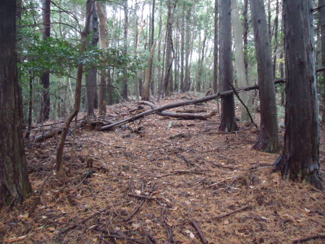 | 参道を示す黄色テープを辿って行ったつもりが道に迷った。GPSのお陰で大事には至らなかったが怖かった。標高400mの山もあなどれない。 松食虫にやられた倒木だらけで、行き止まり(進入禁止)を示す木と倒木とを見間違えたのかもしれない。 |