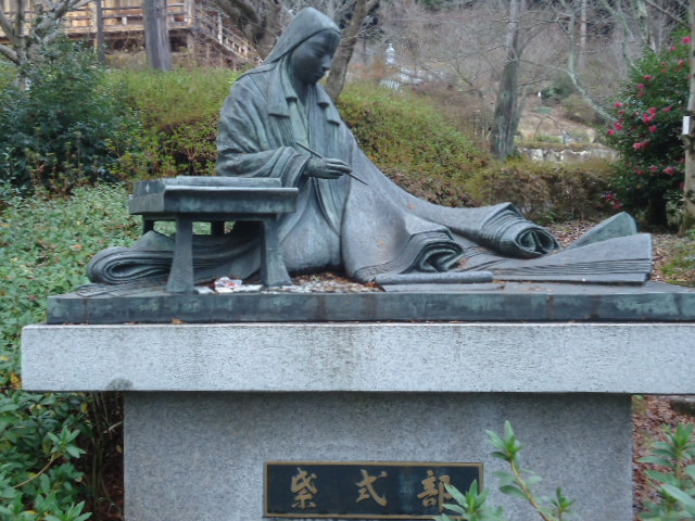 | 紫式部像。 本堂の「源氏の間」は紫式部が「源氏物語」を書いたところと伝えられている。 |