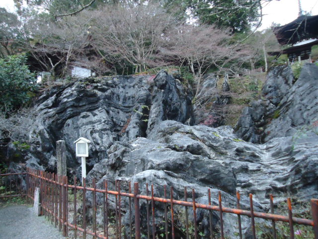 | 石山寺の硅灰石 石灰岩が地中から突出した花崗岩と接触し、その熱作用のために変質したもの。この作用で通常は大理石となりますが、この石山寺のように雄大な硅灰石になっているには珍しいものです。 〜説明板より |