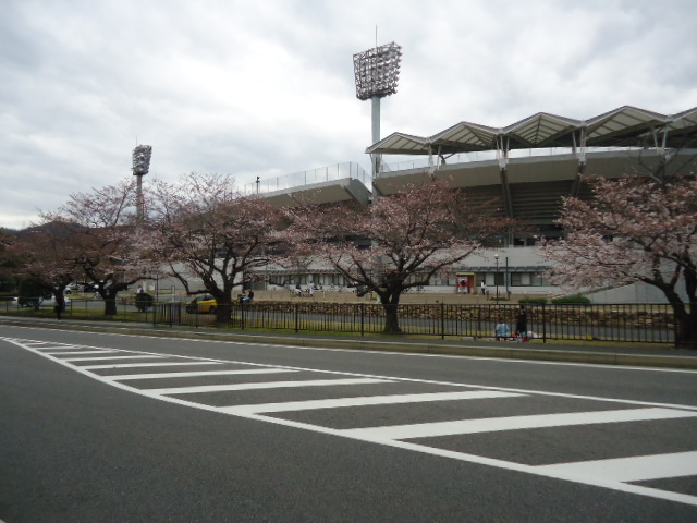 | 7分咲き桜の奥に見えるのは皇子山野球場 |
