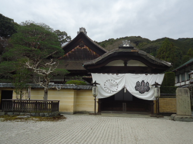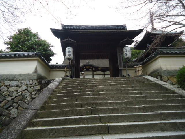 | 三井寺の手前で隣接する「総本山・圓満院門跡」寺院と手前は石庭。 圓満院は、寛和三年(987年)創立村上天皇の第三皇子悟円親王の開基です。三井三門跡の一つであり、開基当時は平等院と号した。藤原道長が宇治に建てた別荘をその子藤原頼道の時代に寺院とするべく下命があり、平等院(後の圓満院)の明尊大僧正によって完成、悟円親王の子永円親王を初代院主として三井平等院の名前を宇治に譲り、現在の宇治平等院の初めとなった。一方三井平等院は明尊大僧正によって圓満院と命名され悟円親王をはじめとして歴代皇族の入室する門跡寺院となりましたが、室町時代後期まで圓満院は三井平等院と通称されました。 〜門跡HPより |