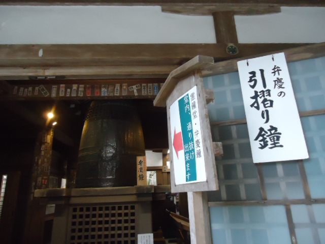 | 弁慶の引摺り鐘 無銘だが、奈良時代に遡る日本でも有数の古鐘である。伝承では、俵藤太こと藤原秀郷がムカデ退治のお礼に琵琶湖の竜神から授かった鐘だと言われ、その後比叡山と三井寺の争いに際して、弁慶が奪って比叡山に引き摺り上げたが、鐘が「イノー」(「帰りたいよう」の意)と鳴ったので、弁慶が怒って谷底へ捨てたという。現状、鐘の表面に見られる擦り傷やひびはその時のものと称する。歴史的には、この鐘は文永元年(1264年)の比叡山による三井寺焼き討ちの際に強奪され、後に返還されたというのが史実のようである。 |