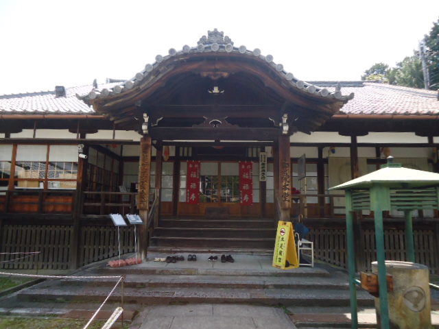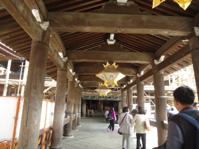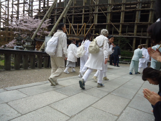 | 納経所で御朱印を書いてもらった後、もうすぐ白装束の一行がみえるのでそこで座って拝んでいなさい言われて拝んでいると私の頭をなでて急ぎ足で駆け抜けていった。 後ろは工事中の本堂。昔ながらの木組みの足場。 |