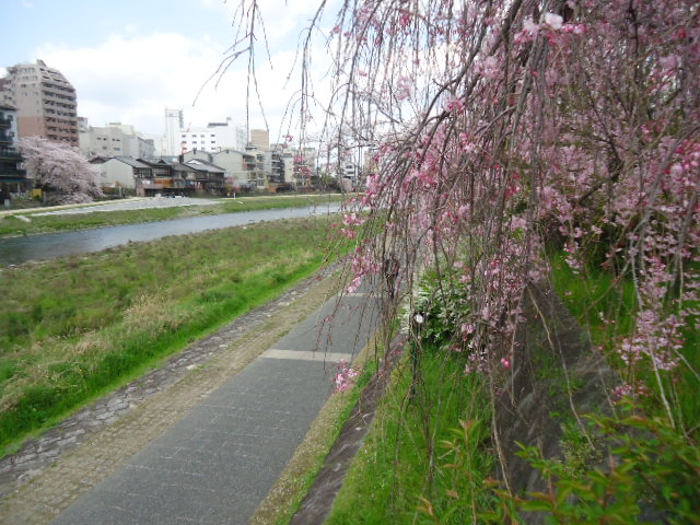 | 鴨川の遊歩道を上流(北)に向かって歩いています。枝垂れ桜も咲き始めていました。 |