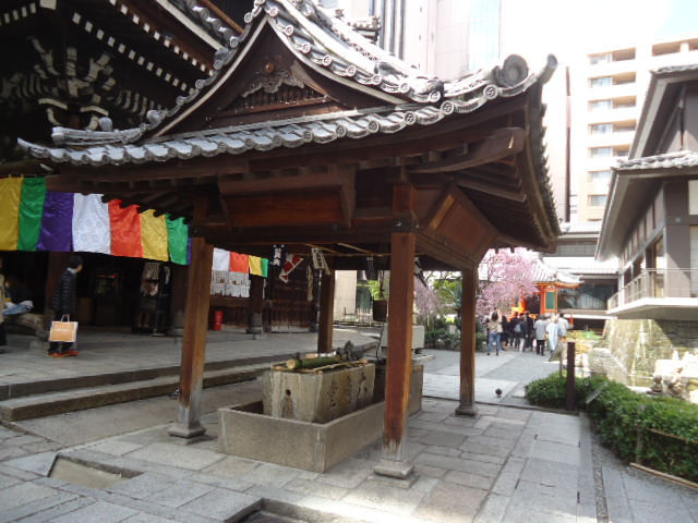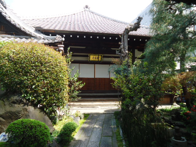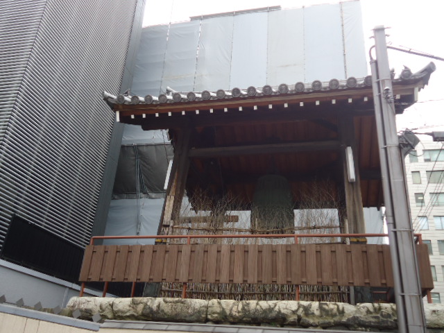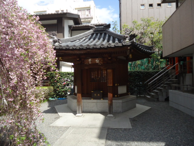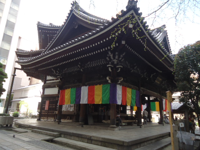 | 本堂 背景に立つビル群に囲まれた寺です。このビルの屋上から見れば、この本堂は六角形に見えるはず。 |