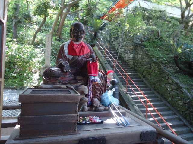 | お身代わり賓頭盧尊者 この像は、お詣りの皆様の心身の病を救い給う有り難い、なで仏です。昭和59年の春、少年の失火であわや本堂焼失の大火になるところお身代わりとなり焼身されました。 その後わが国の仏像修復の第一人者・西村公朝先生御監修のもと、京仏師・佐川定慶師のお手で修復されたものです。 |